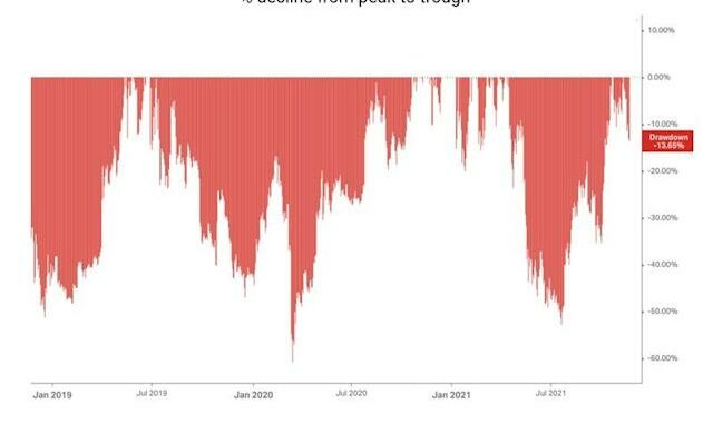The chart below shows BTC’s drawdown, or percentage decline from peak to trough. Currently, bitcoin is down about 13% from an all-time high of around $69,000. A slight drawdown is typical after a price reaches an all-time high, although losses can exceed 10%-15% even within a bull market.