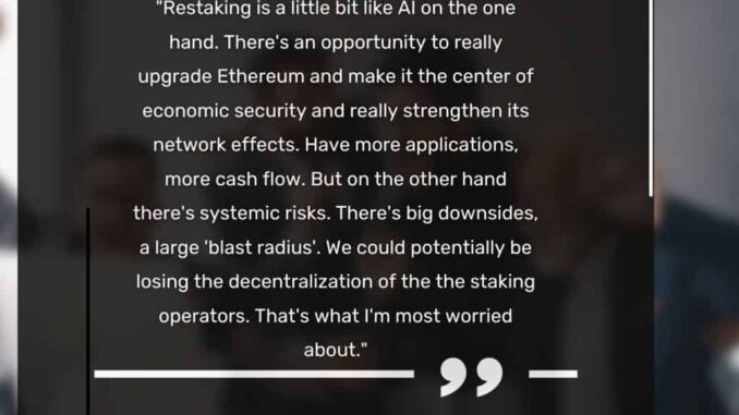 His new role would entail focusing on restaking risks, and his default public stance would be critical of EigenLayer. However, he promised to make his criticism constructive and advocate for mitigating risks like the erosion of solo validators and the intersubjective overloading of Ethereum consensus.