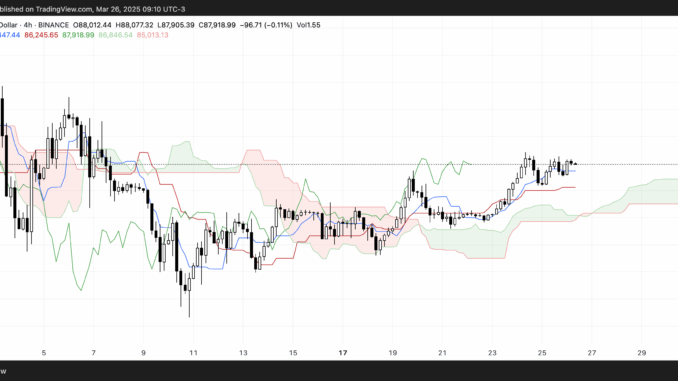 Price action is currently positioned below the Kumo (cloud), which is shaded in green and red—indicating that Bitcoin is trading in a zone of weakness relative to historical and projected momentum.