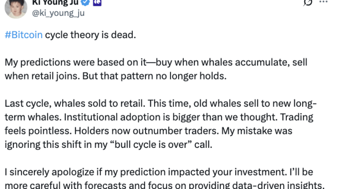 Ki Young Ju, CEO of CryptoQuant and a prominent figure in crypto analysis, has publicly declared that the traditional Bitcoin cycle theory is no longer valid.
