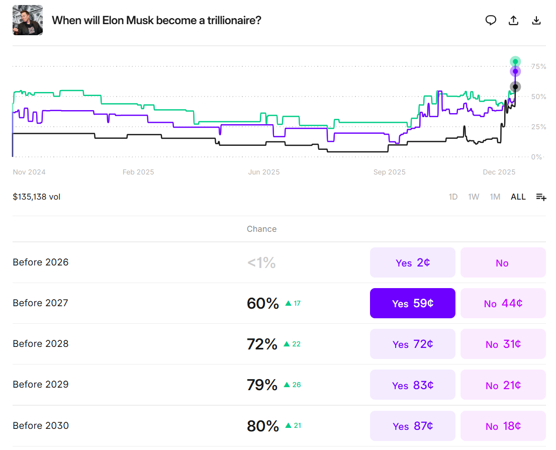 Prediction markets are rapidly repricing Elon Musk’s long-term wealth outlook following his latest net worth increase.