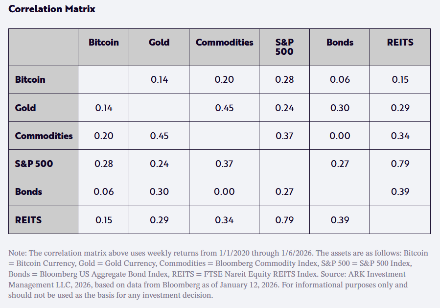 ARK’s analysis of weekly returns from January 2020 to early January 2026 shows that Bitcoin has a modest correlation of 0.14 with gold, much lower than the 0.27 correlation between the S&P 500 and bonds.